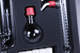 Das Bild zeigt ein Set von Laborgeräten, das in einer schützenden Schaumstoffeinlage untergebracht ist. Zu sehen sind unter anderem ein runder Kolben mit einem roten Stopfen, verschiedene Glasrohre und eine Spirale, die für chemische Experimente verwendet werden.
