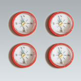 Das Bild zeigt vier Kompasse in rotem Gehäuse, die gleichmäßig angeordnet sind. Jeder Kompass weist die Himmelsrichtungen Norden, Osten, Süden und Westen an, ideal für experimentelle Zwecke im Bildungsbereich.