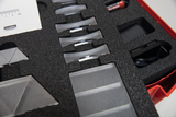 Das Bild zeigt eine Anordnung transparenter geometrischer Formen, die in einer strukturierten Schaumstoffeinlage platziert sind. Diese Materialien können für experimentelle Zwecke im Bildungswesen verwendet werden, um physikalische Konzepte zu veranschaulichen.