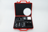 Das Bild zeigt einen roten Koffer, der mit verschiedenen Experimentiermaterialien für den Unterricht ausgestattet ist. In dem Koffer befinden sich eine große runde Scheibe, diverse kleine Teile und Zubehör zum Durchführen von physikalischen Experimenten.